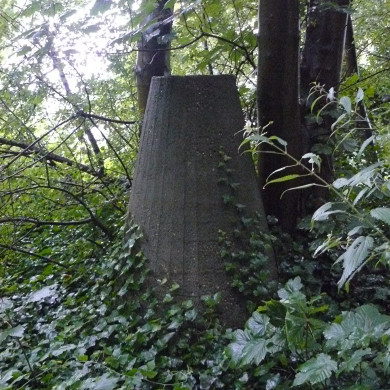 BETONNEN AFFUIT van een standaard type. Het affuit voor de luchtdoelmitrailleur bestaat uit een 1.50 m. hoge, ronde en naar boven taps toelopende kolom van gewapend beton. Het affuit heeft aan de voet een doorsnede van ca. 0.50 m. en aan de bovenzijde van 0.20 m. Aan de bovenzijde een klein rond open gat voor de bevestiging van een mitrailleur, bestemd voor vuur tegen vliegtuigen. Het affuit is geplaatst op een betonnen plaat, gelegen onder het maaiveld.
