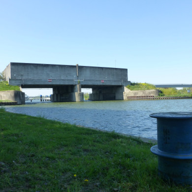 PLOFSLUIS, als vitaal onderdeel van het inundatiesysteem in het gebied tussen de Lek en het IJsselmeer. Het verdedigingssysteem van de Nieuwe Hollandse Waterlinie was in de eerste plaats gebaseerd op het gecontroleerd onder water zetten van (grote) terreinoppervlakken. Gecontroleerde inundatie vergde een ingenieus systeem van waterwerken, zoals sluizen, stuwen en kanalen, waarmee het noodzakelijke peil snel en binnen nauwe grenzen gesteld en gehandhaafd kon worden. Er werden verschillende typen sluizen toegepast, afhankelijk van de plaats waar ze in het systeem functioneerden. Soms werden reeds bestaande scheepvaart-, uitwaterings- of keersluizen gebruikt, maar ook zijn er vele nieuwe gebouwd of bestaande (sterk) aangepast. De zogenoemde Plofsluis in het Amsterdam-Rijnkanaal, nabij de westelijke aftakking van het Lekkanaal, is een unieke variant van de keersluis, een sluistype dat als primair doel heeft water te keren. De bouw van de Plofsluis was het gevolg van de aanleg van het Amsterdam-Rijnkanaal, dat verruiming en gedeeltelijke vervanging van het van omstreeks 1890 daterende Merwedekanaal inhield. Het Amsterdam-Rijnkanaal kwam in twee fasen tot stand: de eerste fase - het kanaal ten noorden van de Lek van Amsterdam tot aan Wijk bij Duurstede en het Lekkanaal - kwam nog grotendeels gereed vóór het uitbreken van de Tweede Wereldoorlog. Het gedeelte van Wijk tot aan Tiel werd pas na de oorlog, in 1952, opgeleverd. Het Amsterdam-Rijnkanaal doorsneed de inundatievelden ten zuiden en ten oosten van Utrecht en zou een onacceptabele verzwakking van de landsverdediging in dit gebied teweegbrengen: de inundatievelden zouden leegstromen via het nieuwe kanaal. Om dit tegen te gaan en de scheepvaart niet onnodig te hinderen is besloten een serie met stortmateriaal te vullen betonnen silo's boven het kanaal aan te leggen, die door opblazen de totale waterloop zouden afsluiten en hiermee ook het acces via het kanaal. In 1937 begon Rijkswaterstaat met de bouw, maar toen de oorlog in mei 1940 ook op Nederlands grondgebied losbarstte, was de Plofsluis nog niet voltooid. De werkzaamheden zijn uiteindelijk niet afgerond en de Plofsluis heeft dus nooit dienst gedaan voor de beoogde functie. Wel zijn er later een schietbaan en opslag voor vervuilde grond in ondergebracht. Aan de noordzijde is tegen de Plofsluis een brug over het Amsterdam-Rijnkanaal geconstrueerd. Deze brug en de in het verlengde ervan gelegen stalen boogbrug over het Lekkanaal (geopend 1938). De iets verderop gelegen Overeindseweg was deels zuidwaarts verlegd, waardoor deze weg via de beide bruggen over de kanalen werd geleid. De brug over het Lekkanaal is uitgevoerd als een boogbrug met verstijfde liggers en de brug is geheel geklonken. De verbinding met de brug naast de Plofsluis en de zuidwaartse aansluiting naar de Vuilcopsekanaaldijk (de westelijke weg langs het Amsterdam-Rijnkanaal) zijn ten dele gebouwd als gewapend betonnen plaatbruggen op betonnen pijlers (ook wel: viaducten). Het laatste segment werd echter uitgevoerd als houten brug, om het eventueel gemakkelijk te kunnen vernietigen en zo het acces af te sluiten. Later is dit deel vervangen door een eveneens betonnen plaatbrug - zij het gedragen door stalen kolommen. Deze werken vormen de aanbrug aan de westzijde van de brug naast de Plofsluis. Dit deel van de brug leidt over en ligt deels op het authentieke westelijke landhoofd van de Plofsluis. Het landhoofd zelf bevat een aantal aan de sluis verwante functies die in een gewapend betonnen constructie zijn ondergebracht en die nog goed herkenbaar zijn. Aan de oostzijde van de Plofsluis was een vergelijkbare constructie gerealiseerd, maar hiervan is veel minder bewaard gebleven. Met name de betonnen en de houten aanbruggen zijn verdwenen. De betonnen constructie is deels opgegaan in een ovaal aardlichaam dat tot stand kwam bij de verbreding van het Amsterdam-Rijnkanaal. In 1982 besloot men het kanaal te vergraven en aan de oostkant om de Plofsluis heen te leiden, aangezien de scheepvaart veel hinder ondervond van de smalle doorvaart ter hoogte van het kunstwerk.