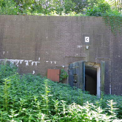 Direct achter en deels in de courtine van de oostelijke fortwal gelegen en aan drie zijden door aardwerk gedekte SCHUILPLAATS MET VERBRUIKSMAGAZIJN C / BOMVRIJ GEBOUW, daterend uit de periode 1878-1882. In de 20ste eeuw voorzien van een nieuwe gevel. In deze gevel een getoogde toegang met dubbele houten deur uit de periode 1878-1882.