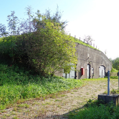 REMISE MET SCHUIL- EN BERGPLAATSEN / BOMVRIJ GEBOUW A1 (noordoostbastion) van een type dat aan drie zijden en bovenop is gedekt met aarde. Met de toename van de draagwijdte van het geschut, de kracht van de inslagen van projectielen en de explosieve kracht van (brisant)granaten werd het steeds moeilijker weerstand te bieden tegen beschietingen. Verzwaring van metselwerk, toepassing van schokabsorberende metselsystemen (onder meer door middel van bogen), flauwe hellingshoeken en gebogen of juist puntige vormen, gebruik van beton - en later van gewapend beton - in steeds zwaardere uitvoering, was een van de manieren om de vestingwerken bestand te houden tegen toenemende aanvalskracht. Bovendien was het aanbrengen van aarddekkingen een goed middel gebleken om de energie te absorberen of te dempen. Dit is de reden waarom vele gemetselde of betonnen werken van een aardlaag of een frontbescherming van zand of aarde zijn voorzien. Afhankelijk van de periode van ontstaan - en daarmee van de te verwachten inslagkracht van projectielen - werd van 'bomvrije gebouwen' gesproken, wanneer ze werden geacht bestand te zijn tegen een van tevoren bepaald aantal inslagen van zwaar kaliber.