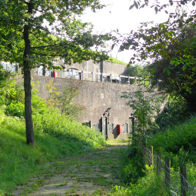 REMISE MET SCHUIL- EN BERGPLAATSEN / BOMVRIJ GEBOUW A2 (zuidoostbastion) van een type dat aan drie zijden en bovenop is gedekt met aarde. Met de toename van de draagwijdte van het geschut, de kracht van de inslagen van projectielen en de explosieve kracht van (brisant)granaten werd het steeds moeilijker weerstand te bieden tegen beschietingen. Verzwaring van metselwerk, toepassing van schokabsorberende metselsystemen (onder meer door middel van bogen), flauwe hellingshoeken en gebogen of juist puntige vormen, gebruik van beton - en later van gewapend beton - in steeds zwaardere uitvoering, was een van de manieren om de vestingwerken bestand te houden tegen toenemende aanvalskracht. Bovendien was het aanbrengen van aarddekkingen een goed middel gebleken om de energie te absorberen of te dempen. Dit is de reden waarom vele gemetselde of betonnen werken van een aardlaag of een frontbescherming van zand of aarde zijn voorzien. Afhankelijk van de periode van ontstaan - en daarmee van de te verwachten inslagkracht van projectielen - werd van 'bomvrije gebouwen' gesproken, wanneer ze werden geacht bestand te zijn tegen een van tevoren bepaald aantal inslagen van zwaar kaliber.