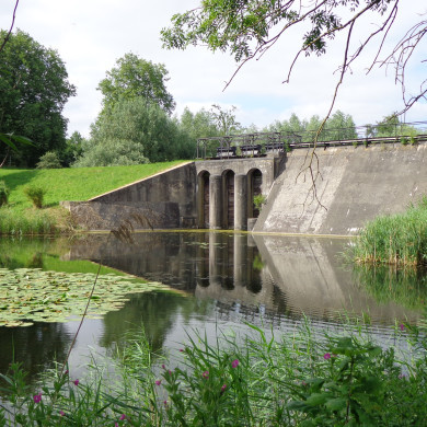 INUNDATIESLUIS / KEERSLUIS bij Fort Everdingen als essentieel onderdeel van het inundatiesysteem van de Nieuwe Hollandse Waterlinie. Het verdedigingssysteem van de Nieuwe Hollandse Waterlinie was in de eerste plaats gebaseerd op het gecontroleerd onder water zetten van (grote) terreinoppervlakken. Gecontroleerde inundatie vergde een ingenieus systeem van waterwerken, zoals sluizen, stuwen en kanalen, waarmee het noodzakelijke peil snel en binnen nauwe grenzen gesteld en gehandhaafd kon worden. Er werden vele verschillende typen sluizen toegepast, afhankelijk van de plaats waar ze in het systeem functioneerden. Soms werden reeds bestaande scheepvaart-, uitwaterings- of keersluizen gebruikt, maar ook zijn er vele nieuwe gebouwd of bestaande (sterk) aangepast. Tot de laatste categorie behoren de inundatiesluizen bij Fort Everdingen. Het gaat hierbij om drie in serie geplaatste exemplaren, waarvan de noordelijkste nog steeds deel uitmaakt van de zomerkade van de Lek. Via deze sluis kon bij lage waterstand water uit de Lek worden ingelaten voor de inundatie van het voorgelegen terrein. Belangrijk was ook de functie als keersluis waarmee het waterpeil in het noordelijk deel van de natte gracht rond het fort in stand werd gehouden. Over de sluis ligt nu een eenvoudige hardhouten brug met multiplex dek. Het inundatiekanaal loopt vanaf de inundatiesluis / keersluis in de zomerkade van de Lek zuidwaarts tot aan de Prijsseweg / Prijssedijk.