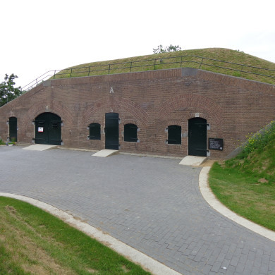 BOMVRIJ GEBOUW A als voorbeeld van een type dat aan drie zijden en bovenop is gedekt met aarde. Met de toename van de draagwijdte van het geschut, de kracht van de inslagen van projectielen en de explosieve kracht van (brisant)granaten werd het steeds moeilijker weerstand te bieden tegen beschietingen. Verzwaring van metselwerk, toepassing van schokabsorberende metselsystemen (onder meer door middel van bogen), flauwe hellingshoeken en gebogen of juist puntige vormen, gebruik van beton - en later van gewapend beton - in steeds zwaardere uitvoering, was een van de manieren om de vestingwerken bestand te houden tegen toenemende aanvalskracht. Bovendien was het aanbrengen van aarddekkingen een goed middel gebleken om de energie te absorberen of te dempen. Dit is de reden waarom vele gemetselde of betonnen werken van een aardlaag of een frontbescherming van zand of aarde zijn voorzien. Afhankelijk van de periode van ontstaan - en daarmee van de te verwachten inslagkracht van projectielen - werd van 'bomvrije gebouwen' gesproken, wanneer ze werden geacht bestand te zijn tegen een van tevoren bepaald aantal inslagen van zwaar kaliber. Gebouw A is gerestaureerd en kreeg een bestemming die aansluit bij het semi-publieke karakter van het Werk aan het Spoel.