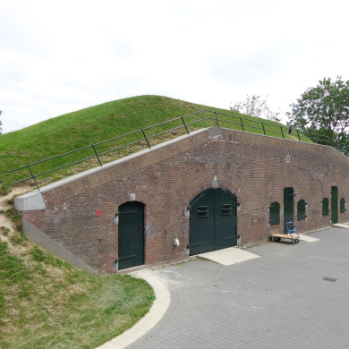 BOMVRIJ GEBOUW D als voorbeeld van een type dat aan drie zijden en bovenop is gedekt met aarde. Met de toename van de draagwijdte van het geschut, de kracht van de inslagen van projectielen en de explosieve kracht van (brisant)granaten werd het steeds moeilijker weerstand te bieden tegen beschietingen. Verzwaring van metselwerk, toepassing van schokabsorberende metselsystemen (onder meer door middel van bogen), flauwe hellingshoeken en gebogen of juist puntige vormen, gebruik van beton - en later van gewapend beton - in steeds zwaardere uitvoering, was een van de manieren om de vestingwerken bestand te houden tegen toenemende aanvalskracht. Bovendien was het aanbrengen van aarddekkingen een goed middel gebleken om de energie te absorberen of te dempen. Dit is de reden waarom vele gemetselde of betonnen werken van een aardlaag of een frontbescherming van zand of aarde zijn voorzien. Afhankelijk van de periode van ontstaan - en daarmee van de te verwachten inslagkracht van projectielen - werd van 'bomvrije gebouwen' gesproken, wanneer ze werden geacht bestand te zijn tegen een van tevoren bepaald aantal inslagen van zwaar kaliber. Gebouw D is gerestaureerd.