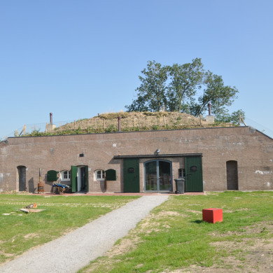 BOMVRIJ BOUWWERK / REMISE, gebouw D, als representant van een type bomvrije bouwwerken dat aan drie zijden en bovenop is voorzien van een aarden dekking en dat alleen een gevel aan de keelzijde bezit. Met de toename van de draagwijdte van het geschut, de kracht van de inslagen van projectielen en de explosieve kracht van (brisant)granaten werd het steeds moeilijker weerstand te bieden tegen beschietingen. Verzwaring van metselwerk, toepassing van schokabsorberende metselsystemen (onder meer door middel van bogen), flauwe hellingshoeken en gebogen of juist puntige vormen, gebruik van beton - en later van gewapend beton - in steeds zwaardere uitvoering, was een van de manieren om de vestingwerken bestand te houden tegen toenemende aanvalskracht. Bovendien was het aanbrengen van aarddekkingen een goed middel gebleken om de energie te absorberen of te dempen. Dit is de reden waarom vele gemetselde of betonnen werken van een aardlaag of een frontbescherming van zand of aarde zijn voorzien. Afhankelijk van de periode van ontstaan - en daarmee van de te verwachten inslagkracht van projectielen - werd van 'bomvrije gebouwen' gesproken, wanneer ze werden geacht bestand te zijn tegen een van tevoren bepaald aantal inslagen van zwaar kaliber. Het bomvrij bouwwerk / remise D van het Fort bij de Nieuwe Steeg bevindt zich op het noordelijke bastion van het werk en dateert van de jaren 1878-1880. Het gebouw is enigs gemoderniseerd en aangepast voor een publieksfunctie.