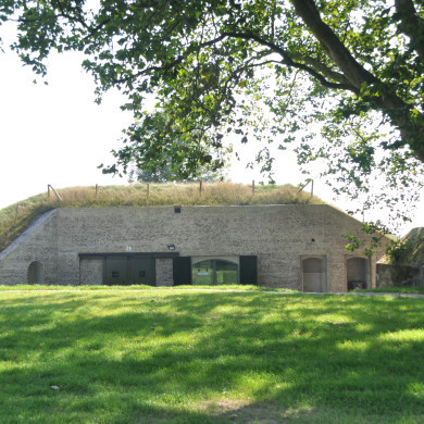 BOMVRIJ BOUWWERK / REMISE, gebouw G, als representant van een type bomvrije bouwwerken dat aan drie zijden en bovenop is voorzien van een aarden dekking en dat alleen een gevel aan de keelzijde bezit. Met de toename van de draagwijdte van het geschut, de kracht van de inslagen van projectielen en de explosieve kracht van (brisant)granaten werd het steeds moeilijker weerstand te bieden tegen beschietingen. Verzwaring van metselwerk, toepassing van schokabsorberende metselsystemen (onder meer door middel van bogen), flauwe hellingshoeken en gebogen of juist puntige vormen, gebruik van beton - en later van gewapend beton - in steeds zwaardere uitvoering, was een van de manieren om de vestingwerken bestand te houden tegen toenemende aanvalskracht. Bovendien was het aanbrengen van aarddekkingen een goed middel gebleken om de energie te absorberen of te dempen. Dit is de reden waarom vele gemetselde of betonnen werken van een aardlaag of een frontbescherming van zand of aarde zijn voorzien. Afhankelijk van de periode van ontstaan - en daarmee van de te verwachten inslagkracht van projectielen - werd van 'bomvrije gebouwen' gesproken, wanneer ze werden geacht bestand te zijn tegen een van tevoren bepaald aantal inslagen van zwaar kaliber. Het bomvrij bouwwerk / remise G van het Fort bij de Nieuwe Steeg bevindt zich op de zuidelijke punt van het werk, ten zuidoosten van gebouw B en ten zuiden van gebouw A1, en dateert van de jaren 1886-1887.