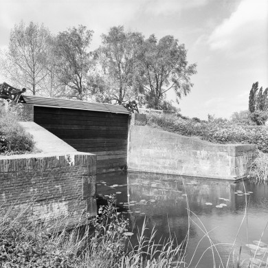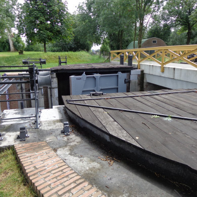 WESTER INUNDATIE- EN KEERSLUIS / WAAIERSLUIS en SCHOTBALKOPSLAG onder de dekking van een rond het midden van de 19de eeuw aangelegde aarden wapenplaats, die mede diende ter verdediging van het rivieracces van de Linge. Het verdedigingssysteem van de Nieuwe Hollandse Waterlinie was in de eerste plaats gebaseerd op het gecontroleerd onder water zetten van (grote) terreinoppervlakken. Gecontroleerde inundatie vergde een ingenieus systeem van waterwerken, zoals sluizen, stuwen en kanalen, waarmee het noodzakelijke peil snel en binnen nauwe grenzen gesteld en gehandhaafd kon worden. Er werden vele verschillende typen sluizen toegepast, afhankelijk van de plaats waar ze in het systeem functioneerden. Soms werden reeds bestaande scheepvaart-, uitwaterings- of keersluizen gebruikt, maar ook zijn er vele nieuwe gebouwd of bestaande (sterk) aangepast. Tot de laatste categorie behoren de inundatiesluizen bij de Wapenplaats bij Asperen. Tot de laatste categorie behoren de vier inundatiesluizen in en langs de Linge bij het Fort bij Asperen. Het betreft twee waaiersluizen in de beide Lingedijken en twee gecombineerde schutsluizen en inundatiesluizen, waarin waaierdeuren én puntdeuren. Via deze sluis kon water uit de Linge worden ingelaten ter inundatie van delen van de rivierpolders tussen de Nieuwe Zuiderlingedijk (aangelegd in 1809) en de Waal. Minstens zo belangrijk was de echter de functie als keersluis: de sluis was onder normale omstandigheden gesloten en was dan onderdeel van de linker Lingedijk. De oorspronkelijke deuren van de inundatiesluis in de zuidelijke of linker Lingedijk waren uitgevoerd in hout, maar deze zijn later - blijkens opschrift in 1924 - vervangen door ijzeren exemplaren. Deze zijn rond 2012 gerestaureerd. Waaiersluizen zijn meerdere keren toegepast als onderdeel van de Nieuwe Hollandse Waterlinie. Ze zijn rond 1800 geïntroduceerd door A.F. Goudriaan en J. Blanken Jzn. en waren voorzien van waaiervormige deuren die het via een ingenieus systeem mogelijk maakten ze tegen de stroom in en tegen hoog water in te bedienen. Dit was uiteraard van groot belang in geval van (oorlogs)dreiging. Over de sluis ligt een latere, gewapend betonnen plaatbrug.