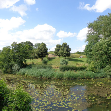 FORTAANLEG EN AARDWERKEN, NATTE GRACHT MET BUITENOEVERS, GLACIS EN DEEL (OMLEIDINGS)WEG EN MET (DOOR GRENSPALEN AANGEDUIDE) MILITAIRE LANDSGROND als basale onderdelen van een geconcentreerd verdedigingswerk nabij een rivieracces.