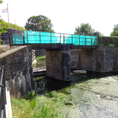 BRUG, KRAANBRUG EN BRUGHOOFD (west), als onderdelen van de toegang tot het Fort bij Vuren. Het ophalen of verwijderen / vernietigen van bruggen is sinds de oudheid een probaat middel om indringers te weren. Niet alleen werd zo de doorgang of overtocht over een waterloop, een droge of een natte gracht of een terreindiepte belemmerd of vertraagd, maar ook moest een aanvaller zelf zorgen voor middelen om de barrière eventueel zelf te nemen. Houten bruggen waren relatief snel te vernietigen, desnoods door ze in brand te steken. Stenen bruggen vergden een grotere en meer tijdrovende ingreep, al kon een springlading soms snel het gewenste effect sorteren. Met de komst van ijzeren bruggen - in de loop van de 19e eeuw op grote schaal toegepast in vele verschillende varianten - bleef de tweede mogelijkheid bestaan, maar verdween de eerste. Bovendien was het opblazen van bruggen ook een grove manier van kapitaalvernietiging. Een van de manieren waarop ijzeren bruggen afgesloten konden worden was die van het uitnemen of ontoegankelijk maken van kleine delen ervan. Dit gebeurde vanaf het derde kwart van de 19e eeuw - behalve door ophalen - onder andere door de defensieve toepassing van zogenoemde kraanbruggen, zowel in wegen als in spoorwegen. Zulke kraanbruggen konden via een verticale as opzij worden geklapt om zo een open ruimte te maken. Civiele kraanbruggen waren eerder toegepast bij kruisingen van waterwegen en spoorlijnen, maar ze zijn onder meer ook in de Nieuwe Hollandse Waterlinie gebruikt, zoals bij de Diefdijk, te Naarden en bij het Fort bij Vuren. Bij het Fort bij Vuren lagen aanvankelijk twee afzonderlijke bruggen die onder een stompe hoek van ongeveer 600 ten opzichte van elkaar samenkwamen op hetzelfde landhoofd aan de buitenzijde van de gracht. De zuidelijke kruiste de torengracht en de noordelijke de keelgracht van de (vroegere) lunet. De eerste is in een later stadium verwijderd. De andere, die ook een zogenoemde kraanbrug omvatte, is ten dele gehandhaafd. Het grootste deel van de overspanning van het water bij het Fort bij Vuren vond plaats door middel van een ijzeren brug met leuningen met gekruiste of spinwebverbindingen tussen de stijlen; een kleiner deel werd afgesloten door middel van een kraanbrug maar de kraanbrug werd feitelijk buiten gebruik gesteld en is deels vervangen. Het geheel dateerde vermoedelijk uit de periode 1850-1880. De drie hoofden zijn in later jaren overspannen door een brug op ijzeren balken, waarbij de kraanbrug ten dele is gehandhaafd. De kraanbrug en de liggerbrug zijn inmiddels gerestaureerd en deels gereconstrueerd.
