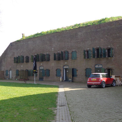 BOMVRIJ GEBOUW, KAZERNE B als een door een aarden dekking tegen inslagen van projectielen beveiligd onderkomen voor manschappen en materieel. Kazerne B is aan de linkerzijde (oost) als aanbouw aan de Toren A, ermee verbonden door middel van een keermuur. Met de toename van de draagwijdte van het geschut, de kracht van de inslagen van projectielen en de explosieve kracht van (brisant)granaten werd het steeds moeilijker weerstand te bieden tegen beschietingen. Verzwaring van metselwerk, toepassing van schokabsorberende metselsystemen (onder meer door middel van bogen), flauwe hellingshoeken en gebogen of juist puntige vormen, gebruik van beton - en later van gewapend beton - in steeds zwaardere uitvoering, was een van de manieren om de vestingwerken bestand te houden tegen toenemende aanvalskracht. Bovendien was het aanbrengen van aarddekkingen een goed middel gebleken om de energie te absorberen of te dempen. Dit is de reden waarom vele gemetselde of betonnen werken van een aardlaag of een frontbescherming van zand of aarde zijn voorzien. Afhankelijk van de periode van ontstaan - en daarmee van de te verwachten inslagkracht van projectielen - werd van 'bomvrije gebouwen' gesproken, wanneer ze werden geacht bestand te zijn tegen een van tevoren bepaald aantal inslagen van zwaar kaliber.