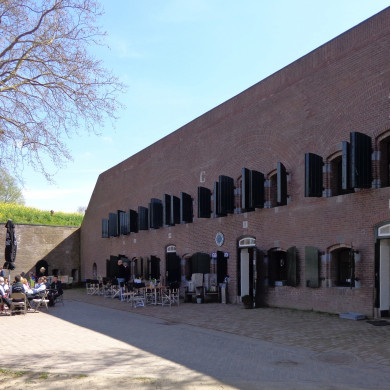 BOMVRIJ GEBOUW, KAZERNE C als een door een aarden dekking tegen inslagen van projectielen beveiligd onderkomen voor manschappen en materieel. Kazerne C is aan de rechterzijde (west) als aanbouw aan de Toren A, ermee verbonden door middel van een keermuur. Met de toename van de draagwijdte van het geschut, de kracht van de inslagen van projectielen en de explosieve kracht van (brisant)granaten werd het steeds moeilijker weerstand te bieden tegen beschietingen. Verzwaring van metselwerk, toepassing van schokabsorberende metselsystemen (onder meer door middel van bogen), flauwe hellingshoeken en gebogen of juist puntige vormen, gebruik van beton - en later van gewapend beton - in steeds zwaardere uitvoering, was een van de manieren om de vestingwerken bestand te houden tegen toenemende aanvalskracht. Bovendien was het aanbrengen van aarddekkingen een goed middel gebleken om de energie te absorberen of te dempen. Dit is de reden waarom vele gemetselde of betonnen werken van een aardlaag of een frontbescherming van zand of aarde zijn voorzien. Afhankelijk van de periode van ontstaan - en daarmee van de te verwachten inslagkracht van projectielen - werd van 'bomvrije gebouwen' gesproken, wanneer ze werden geacht bestand te zijn tegen een van tevoren bepaald aantal inslagen van zwaar kaliber.