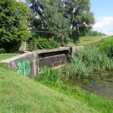 BRUG EN KEERSLUIS (oost) ten westen van een niet meer bestaand stoomgemaal en samen deel uitmakend van de voorzieningen ter afsluiting van de fortgracht en de uitwatering van het gemaal, daterend van 1924. De ten dele in ijzer uitgevoerde BRUG fungeerde als bedieningsbrug voor de afsluiting van de uitwatering en is daartoe mede voorzien van een ijzeren leuning en andere hulpconstructies. De KEERSLUIS bestaat uit twee relatief hoge, betonnen hoofden met diagonale vleugelmuren en aanpalende (betonnen) delen en is voorzien van meerdere schotbalksponningen en een kering. Typologisch betreft het een keersluis in een uitvoering die zeldzaam is binnen de Nieuwe Hollandse Waterlinie. Het relict is een relatief zeldzaam voorbeeld van een zelfstandig waterbouwkundige voorziening / bouwwerk dat gespaard bleef na de sloop van het gemaal waarbij het behoorde.