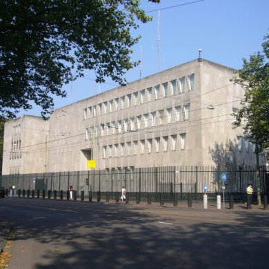 Ambassadegebouw, binnenplaats met muur op de parkeerkelder, auditorium en beveiligingsunit.