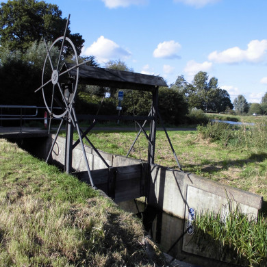SCHUT / SLUISJE ter regulering van het waterniveau en aangebracht op de overgang van de fortgracht naar de wetering langs de Gageldijk. Het vrijwel geheel in ijzer uitgevoerde mechaniek van het schut heeft aan weerszijden betonnen vleugels of keermuren en een houten schuif als waterkering. De schuif kan worden bewogen via een windas en een handmatig te bedienen rad met spaken. Boven de windas een afdakje in metaal.