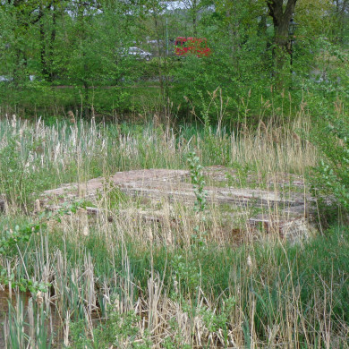 FUNDAMENT van BOMVRIJ (WACHT)GEBOUW D, als relict van het op het restant van het ravelijn gelegen wachthuis aan de noordelijke - naar de frontzijde gekeerde - toegang tot het fort. Een bomvrij (wacht)gebouw is een verdedigbaar onderkomen met voorzieningen voor manschappen en hun materieel dat bestand is tegen inslagen van projectielen van een vooraf gedefinieerd kaliber. Met de toename van de draagwijdte van het geschut, de kracht van de inslagen van projectielen en de explosieve kracht van (brisant)granaten werd het steeds moeilijker weerstand te bieden tegen beschietingen. Verzwaring van metselwerk, toepassing van schokabsorberende metselsystemen (onder meer door middel van bogen), flauwe hellingshoeken en gebogen of juist puntige vormen, gebruik van beton - en later van gewapend beton - in steeds zwaardere uitvoering, was een van de manieren om de vestingwerken bestand te houden tegen toenemende aanvalskracht. Bovendien was het aanbrengen van aarddekkingen een goed middel gebleken om de energie te absorberen of te dempen. Dit is de reden waarom vele gemetselde of betonnen werken van een aardlaag of een frontbescherming van zand of aarde zijn voorzien. Afhankelijk van de periode van ontstaan - en daarmee van de te verwachten inslagkracht van projectielen - werd van 'bomvrije gebouwen' gesproken, wanneer ze werden geacht bestand te zijn tegen een van tevoren gedefinieerd aantal inslagen van zwaar kaliber.