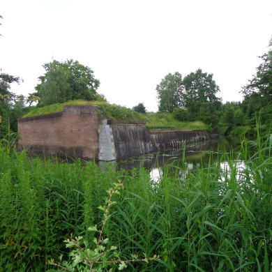 - LUNETAANLEG MET DOOR BAKSTENEN BEKLEDINGSMUREN VERSTERKTE AARDWERKEN, RESTEN VAN GESCHUTSOPSTELPLAATSEN, NATTE GRACHT MET BUITENOEVERS, MET (OMLEIDINGS- EN ONDERHOUDS-)WEGEN, BETONNEN TRAP EN ENVELOPPE / GLACIS EN MET (VOORHEEN) DOOR GRENSPALEN AANGEDUIDE ZONE (MILITAIRE LANDSGROND)
