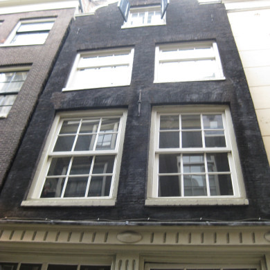 Behorende bij Nieuwebrugsteeg 13?. Vierraamsgevel onder rechte lijst (XVIII) en dwars dak. Bovenlicht XIXA, goede roedenverdeling.