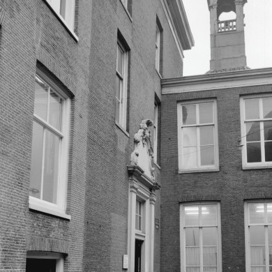 a) Zuidvleugel (1606, door Hendrik de Keyzer), met trapeziumvormige top en versiering van banden en kleine blokjes. Zandstenen poortje.