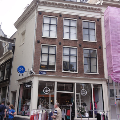 Hoekhuis onder schilddak, met gevels onder omlopende rechte klossenlijst (1e helft 19e eeuw). In de vensters op de verdiepingen een empire roedenverdeling.