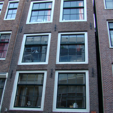 17e eeuws huis met gevel op karakteristieke hoge houten pui en latere punttop. In de vensters een goede roedenverdeling. Houten trapje naar de deuren in Jordaanse trant.