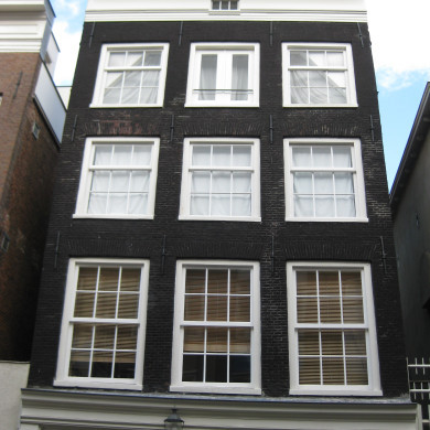 Huis uit de eerste helft van de 17e eeuw, waarvan de gevel op karakteristieke hoge pui is voorzien van bakstenen banden en "blokken" in de ontlastingsbogen en wordt bekroond door een klokvormige top met rollagen (19e eeuw). Twee 17e eeuwse lelie-ankers; houten stoeptrapje naar Jordaanse trant.