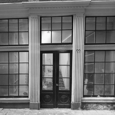 Pand met gevel (XVIII) onder rechte lijst (XIXa). Gesneden houten pui (XIXa) waarvan de deuren XIXc van gietijzeren lofwerk zijn voorzien.
