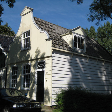 Houten huis met uit- en ingezwenkt voorschot. Huidig aspect 19e eeuw.