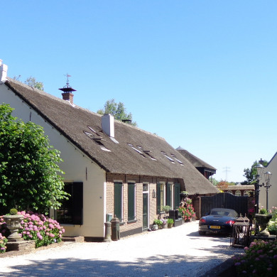 BOERDERIJ onder rieten dak, het voorste, onderkelderde deel van het woonhuis dwars geplaatst. Negenruitsvensters (XVIII).