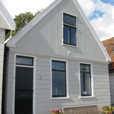 Houten huis met puntvormig voorschot; goede pui.