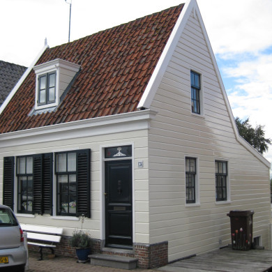 Houten huis met 17e eeuws skelet. Houten voorschot, goede pui. Gepotdekselde zijwanden.