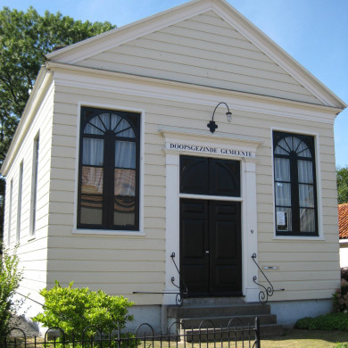 DOOPSGEZINDE KERK. Zaalvormig houten gebouw (1843) met boogramen in rechthoekige omsluiting en deur in omlijsting. Fronton vormige gevelbekroning.