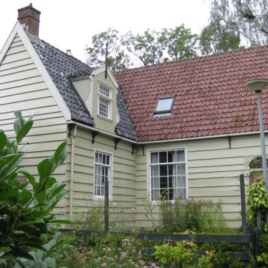 Tweebeukig houten huisje (constructie 18e eeuws of ouder?). Uitwendig voorkomen, met puntvormig voorschot, 19e eeuws.