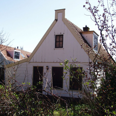 Houten huis met puntvormig voorschot. Uitwendig voorkomen 19e eeuws, constructie waarschijnlijk ouder.
