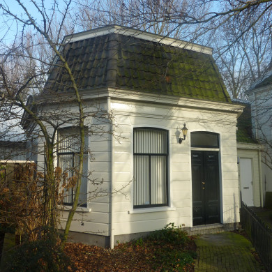 Consistoriekamer van de Herv.gemeente. Houten gebouwtje met afgeschuinde hoeken (XIXc).