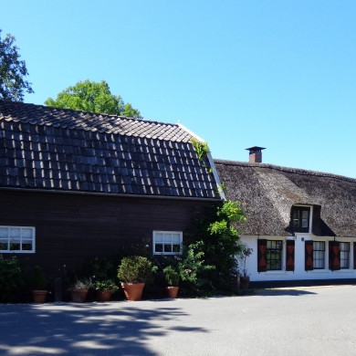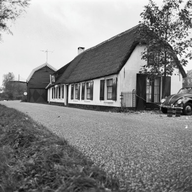 Boerderij-uitspanning De Vink. Langgerekt witgepleisterd gebouw onder afgewolfd rieten dak, de vensters aan de straatzijde voorzien van een negenruits roedenverdeling (XVIII ?).