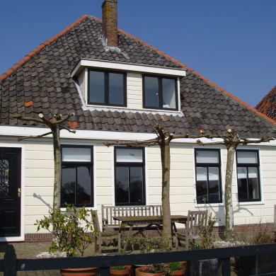 Houten huis met puntvormig voorschot. Uitwendig voorkomen voornamelijk 19e eeuws.