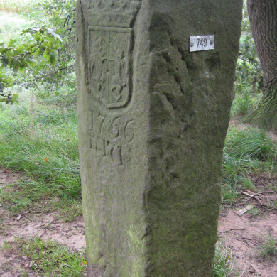 Terzijde van de Veenhuisweg bij de Bodendijk naast grenspaal 749 op een heuveltje, de rode, Bentheimerstenen GRENSSTEEN nr 171 met de wapens van Gelderland en Munster en het jaartal 1766.