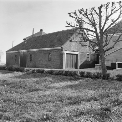 Boerderij, hoge afgewolfde voorgevel, 2 ronde venstertjes met natuursteen, opkamer gepleisterd, 17e eeuw.