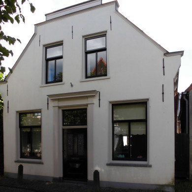Gepleisterd pand waarschijnlijk 18e eeuw met zadeldak en puntgevel, waarin deur en schuiframen eerste helft 19e eeuw.