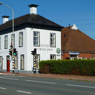 Cafe-slijterij met aangebouwd bedrijfsgedeelte. Het twee bouwlagen tellende hoofdgebouw is in aanleg mogelijk 18e eeuws; het is uit witgesausde baksteen opgetrokken en wordt gedekt door een met blauwe tuiles du nord pannen belegd schilddak met twee topschoorstenen; goot met eenvoudige geprofileerde gootlijst langs voor- en zijgevels; goot op klossen langs achtergevel; staafankers. Op de hoeken der voorgevel bakstenen pilasters. Zesruitsschuifvensters en vensters zonder roedenverdeling in voor- en zijgevels. De achtergevel is blind. Het (vermoedelijk later) parallel aan het hoofdgebouw eveneens in baksteen koud opgetrokken bedrijfsgedeelte, wordt gedekt door een deels met riet, deels met hollandse pannen belegd schilddak en aan een zijde doorgetrokken schild. Twee stel inrijdeuren en deuren en vensters van verschillende soort.