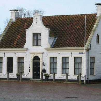 Eenvoudig pand onder afgewolfd zadeldak, belangrijk wegens de ligging.