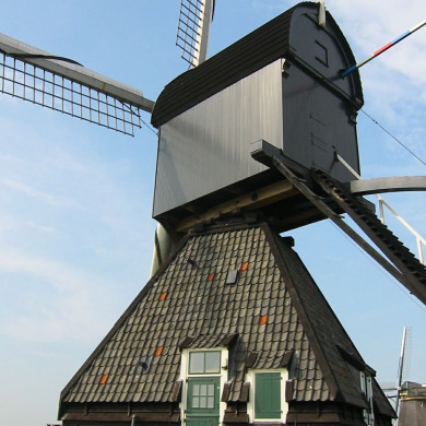 Wipwatermolen "De Blokker", onderdeel van het molencomplex aan de Kinderdijk, enige wipmolen in zuid-holland, waarvan de ondertoren met pannen is gedekt.