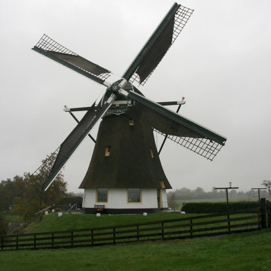 Poldermolen. Noordzijde van de Akkersloot bij Rijpwetering. Achtkantige, houten molen, met riet gedekt, op stenen voet, gedateerd 1793.
