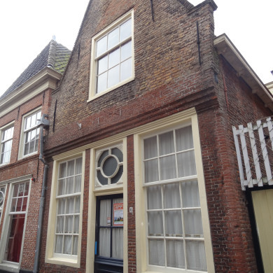 Pand dat oorspronkelijk evenals Achterdam 8 waarschijnlijk een topgevel had; nu wordt de gevel door een kroonlijst afgesloten. Geprofileerde bakstenen waterlijst.