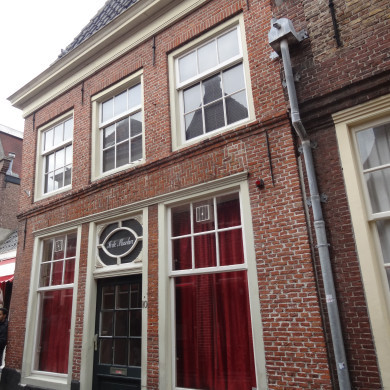 Pand met tuitgevel met geprofileerde natuurstenen platen op de schouders en op de top; rollagen op de schuine zijden. Overkragende verdieping met negenruitsschuifvensters; de pui heeft een deur met bovenlicht, geflankeerd door vijftienruitsschuifvensters. Stoep.