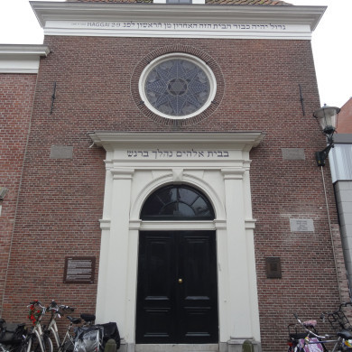 Synagoge. Pand met lijstgevel; dakkapel met omlijsting. Ingangsomlijsting in poortvorm: pilasters met hoofdgestel en een halfrond bovenlicht gevat in een boog die op imposten ontspringt. In het gevelvlak verder een rond venster en twee gevelstenen met inscriptie. XVIII-XIX.