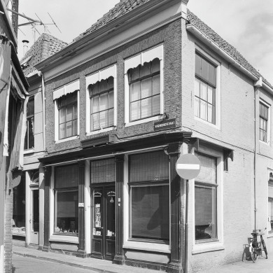 Hoekpand. Aan de Huigbrouwerstraat lijstgevel. Winkelpui uit de tweede helft van de negentiende eeuw met gecanneleerde pilasters en middendeur. Negenruitsschuifvensters op de verdieping en in de gevel aan de Laat.