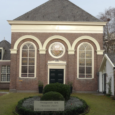 Doopsgezinde Kerk. Eenvoudig zaalkerkje (XIX B ?). De lijstgevel aan de voorzijde is door vier pilasters, onderling door geprofileerde natuurstenen rondbogen verbonden, als een arkade geleed. In het middelste boogveld rechthoekige ingang met omlijsting, in de beide andere boogvelden rondboogvensters. Inwendig een plafond in de vorm van een halve ellips. Tweeklaviers mechanisch orgel met aangehangen pedaal, gemaakt door Flaes & Brünjes, Amsterdam, in 1866 met gebruikmaking van een 18e-eeuws front.