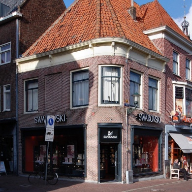 Pand op hoek van Mient en Langestraat. De gevels, beide voorzien van lijst met trigliefconsoles, zijn verbonden door een gebogen travee, waarvan de risaliet zich in de lijst voortzet. Op de verdiepingen negenruitsschuifvensters. Zoldervensters opgenomen in het fries van de lijst.