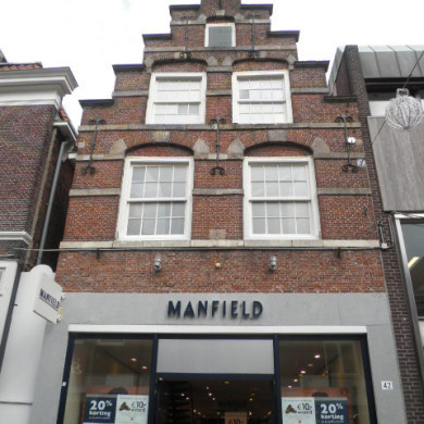 Pand met lijstgevel. De forse kroonlijst voorzien van gesneden consoles met ionische kapitelen en van modillons. Twintig- en zestienruits getoogde schuifvensters, die van de verdieping met geprofileerde natuurstenen vensterdorpels. Moderne winkelpui. XVIII-XIX.